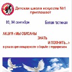 3 и 4 сентября в Детской школе искусств прошла Акция «Мы обязаны знать и помнить…» в рамках дня солидарности в борьбе с терроризмом. Задачи Акции: - акцентировать внимание учащихся на необходимости проявления бдительности с целью профилактики совершения террористических актов; - содействовать формированию толерантности и профилактики межнациональной розни и нетерпимости; - содействовать формированию чувства милосердия к жертвам терактов (на примере Беслана). »»»